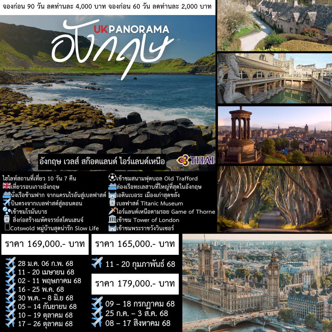 เข้าชมโรมันบาธ สิ่งก่อสร้างมหัศจรรย์สโตนเฮนจ์ Cotswold เข้าชม Old Trafford ล่องเรือทะเลสาบที่ใหญ่ที่สุดในอังกฤษ เอดินเบอระ เมืองเก่าสุดขลัง เบลฟาสต์ Titanic Museum ไอร์แลนด์เหนือตามรอย Game of Thorne เข้าชม Tower of London เข้าชมพระราชวังวินเซอร์ นั่งเรือข้ามฟากจากแครนไรอันสู่เบลฟาสต์ บินตรงจากเบลฟาสต์สู่ลอนดอน