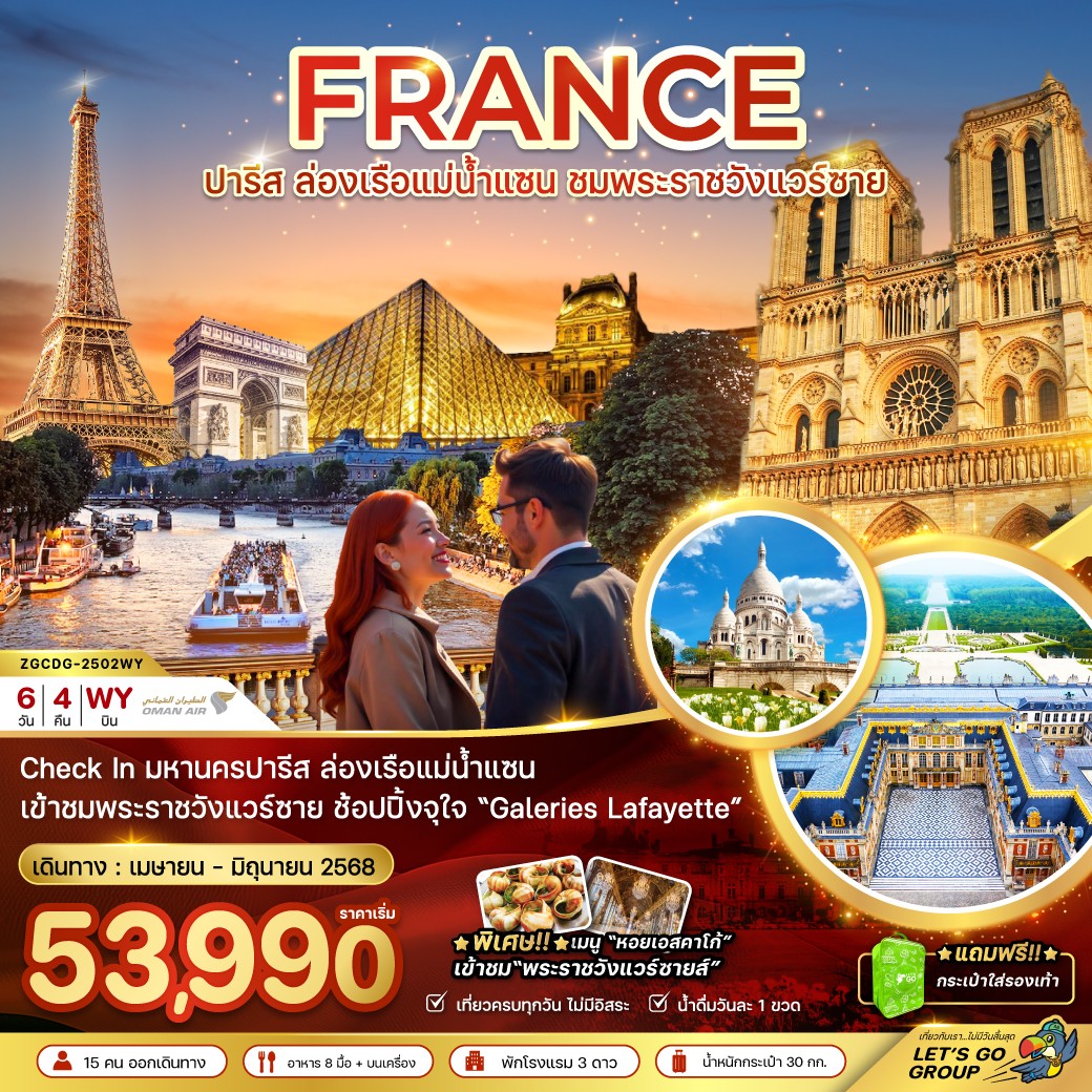ทัวร์ฝรั่งเศส ปารีส (ล่องเรือบาโต มูช พระราชวังแวร์ซายน์ ช้อปปิ้ง GALLERIE LAFAYETTE) 6วัน 4คืน (WY)