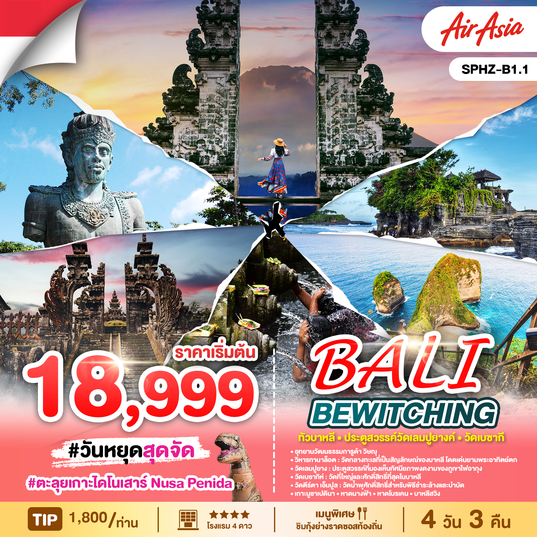 เดนพาซาร์-ยอร์กยาการ์ต้า–มหาเจดีย์บุโรพุทโธ– วัดปะวน-วัดเมนดุท–วัดพรามนันต์–ย่านมาลิโอโบโร ยอร์กยาการ์ต้า–เดนพาซาร์-สวนพระวิษณุ- วิหารอูลูวาตู-ชมการแสดงระบำเกอจัก (รวมโชว์) วัดเบซากีย์-เทือกเขา Kintamani-วิหารศักดิ์สิทธิ์ เทมภัคศิริงค์วิหารทานาล็อท-ช็อปปิ้งของที่ระลึก