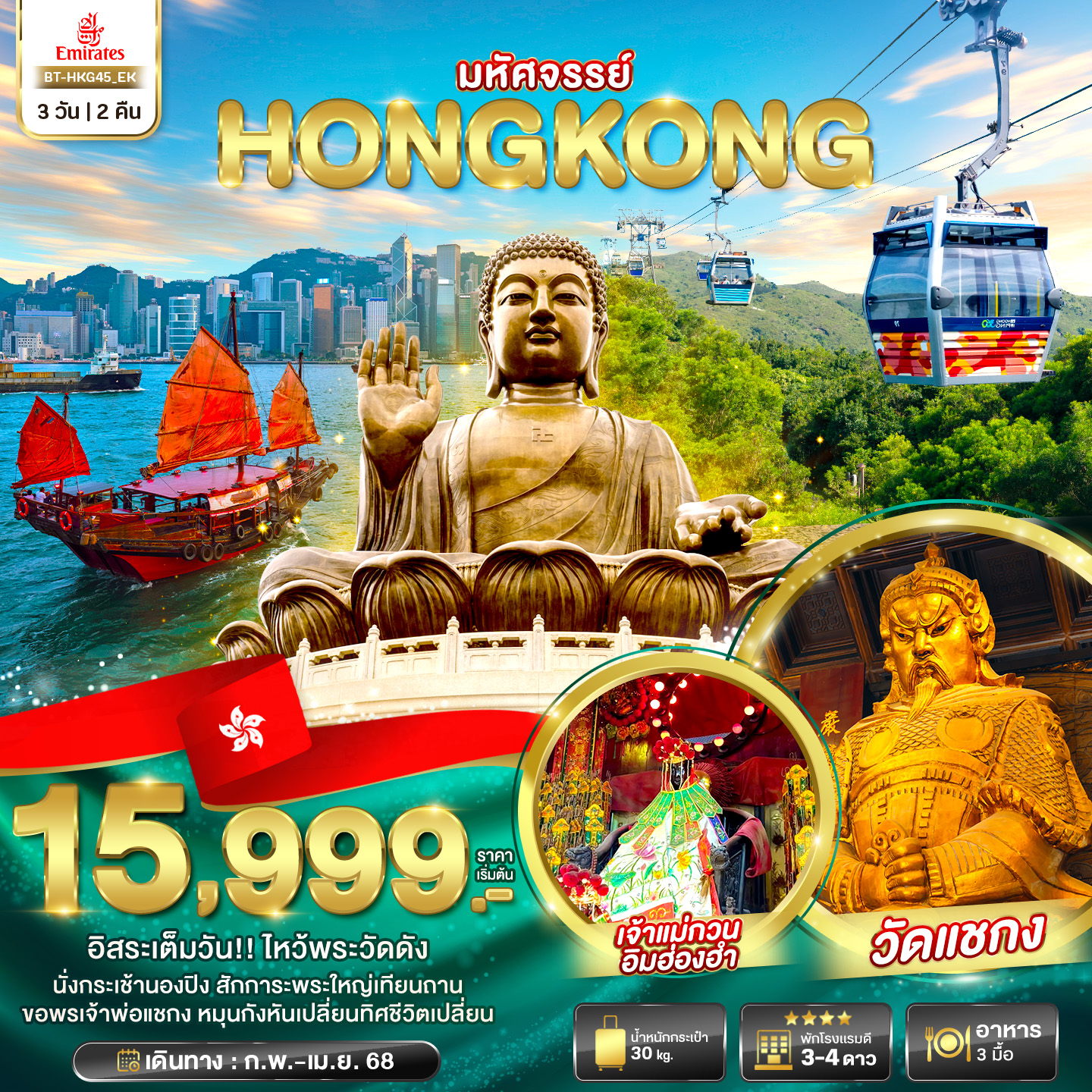 เที่ยวฮ่องกง สุดคุ้ม !! บินตรงลงฮ่องกง-กลับมาเก๊า เที่ยว 2 ประเทศ ไหว้พระขอพรวัดดัง เจ้าแม่กวนอิมฮองฮำ เจ้าแม่กวนอิมรีพลัสเบย์ ขอพรวัดกังหัน วัดอาม่า และเจ้าแม่กวนอิมริมทะเล ช้อปปิ้งร้านหยก ร้านกังหัน และย่านสุดฮิตจิมซาจุ่ย มีอิสระฟรีเดย์ 1 วัน เลือกซื้อทัวร์เสริมดิสนีย์แลนด์/NONG PING CITY TOUR มาเก๊า 1 วันเต็ม โบสถ์เซ็นต์พอล-THE VENETIAN