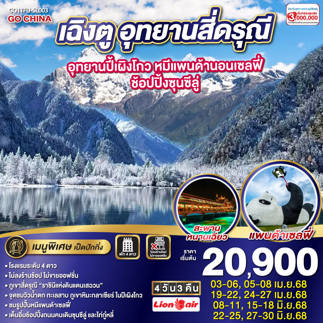 เที่ยวจีน อุทยานภูเขาสี่ดรุณี (ซื่อกูเหนี่ยงซาน) • หุบเขาซวงเฉียวโกว • เมืองตูเจียงเอี้ยน จัตุรัสหย่างเทียนวู • หมีแพนด้าเซลฟี่ • เมืองโบราณกวนเสี้ยน • เลือกซื้อ OPTION ศูนย์อนุรักษ์หมีแพนด้า (รวมรถแบตเตอรี่) • เมืองเฉิงตู • ถนนคนเดินซอยกว้างซอยแคบ ตงเจียวจี้อี้ • ถนนคนเดินชุนซีลู่ • หมีแพนด้าปีนตึก IFS • ถนนไท่กู๋ลี่