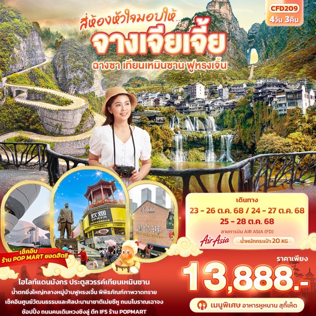 เที่ยวจีน ฉงชิ่ง - ชมรถไฟฟ้าทะลุตึก - มหาศาลาประชาคม (ชมด้านนอก) - ร้านยา - โรงงามเก่าเอ๋อหลิงที่2 - ศูนย์ศิลปะกั๋วไท่ตึกตะเกียบ (ชมด้านนอก) – ถนนเก่าสือป้าตี้ – ถนนคนเดินเจียฟางเป่ย - ตึกหงหยาต้งยามค่ำคืน OPTION A : หม้อไฟฉงชิ่ง + นั่งรถไฟขบวนวิ่งทะลุตึก + ล่องเรือแม่น้ำค่ำคืน FREE DAY : อิสระท่องเที่ยวภายในเมืองฉงชิ่ง OPTION B : มรดกโลกทางธรรมชาติหลุมบ่อฟ้าและสะพานสวรรค์ (รวมค่าอาหารกลางวัน) 780 หยวน/ท่าน OPTION C : มรดกโลกพระแกะสลักหินแห่งต้าจู๋ (รวมค่าอาหารกลางวัน+มื้อเย็น) 780 หยวน/ท่าน OPTION D : สวนสัตว์ฉงชิ่ง + กระเช้าข้ามแม่น้ำแยงซีเจียง + นั่งรถเที่ยวชมวิวสีแสงฉงชิ่ง+POP MART+ตึก World Trade ร้านยางพารา - ตึกไคว่ชิงโหลชั้น22 - ถนนสไตล์สาธารณรัฐจีน - ร้านหยก - เมืองโบราณฉือฉีโข่ว – ถนนกราฟฟิตี้ – ร้านน้ำชาเจียวท่ง